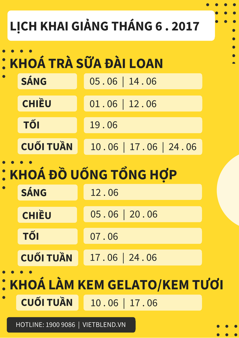 LỊCH KHAI GIẢNG CÁC KHOÁ PHA CHẾ ĐỒ UỐNG TẠI VIETBLEND THÁNG 4/2023 Chuỗi ngày nắng nóng đã bắt đầu, chính là lúc để chủ quán “tung chiêu” đón khách bằng menu thức uống giải khát ấn tượng về cả chất lượng lẫn hình thức! Nhanh tay đăng ký tham gia các khoá đào tạo pha chế tại Vietblend hôm nay để sở hữu ngay BỘ CÔNG THỨC đồ uống …